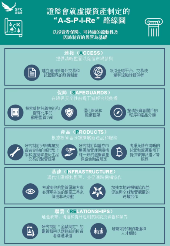 兩份通函的發佈並非孤立的政策舉措,而可視為香港證監會於 2025 年 2 月 19 日發佈的「ASPIRe」路綫圖在制度層面的具體落實。該路綫圖以五大支柱為框架:Access(市場準入)、Safeguards(安全保障)、Products(産品發展)、Infrastructure(基礎設施)與 Relationships(行業合作),明確了香港加密資産市場的長期監管方向。