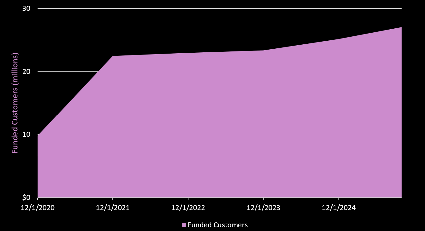 截至 2025 年 9 月 30 日,Robinhood 擁有 2710 萬付費用戶。過去五年用戶增長率為 22.6%,其中大部分增長發生在 2020 年。