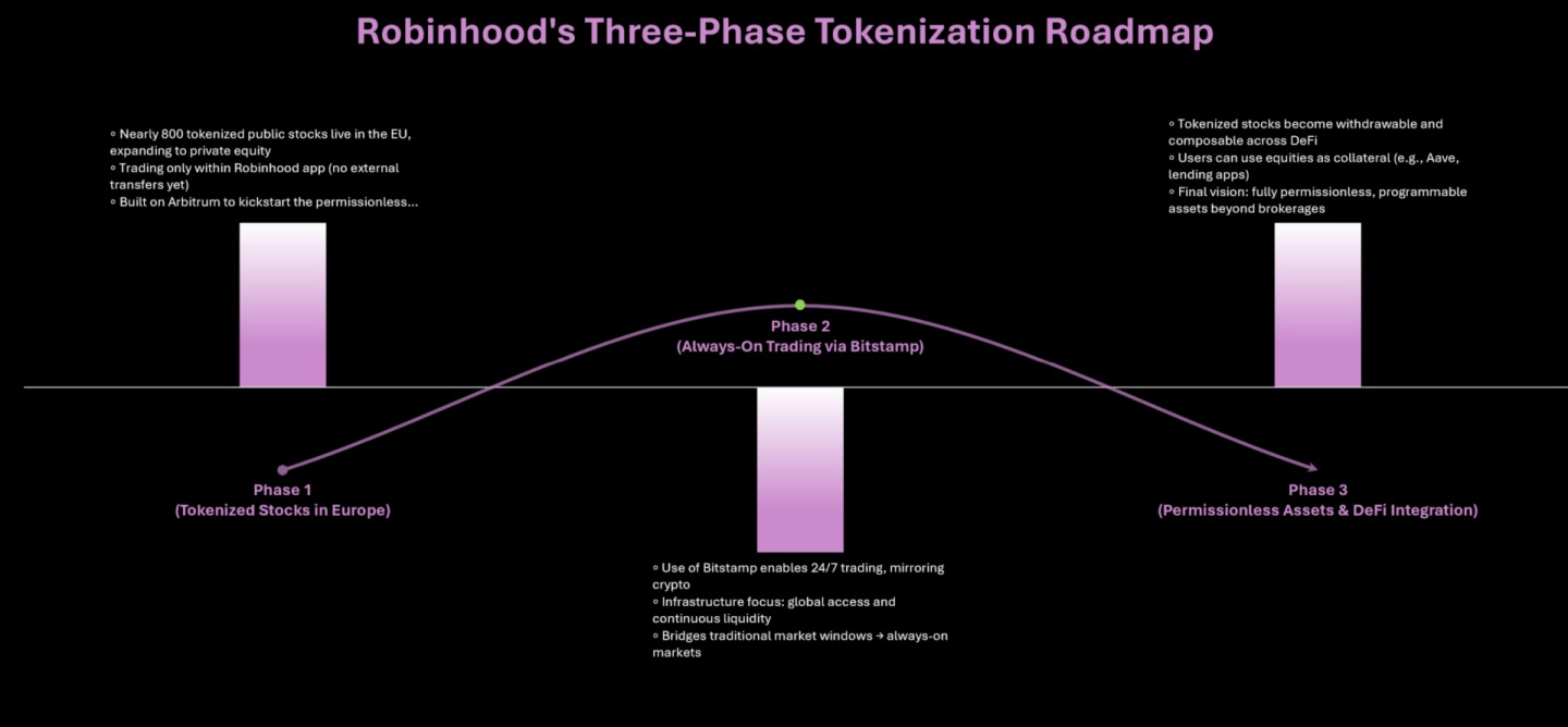 - 宣佈計劃對公共與私人股權進行代幣化(全天候交易、即時結算、與 DeFi 集成、美國以外用戶可進行全球訪問、成本結構低於傳統經紀商渠道)。
