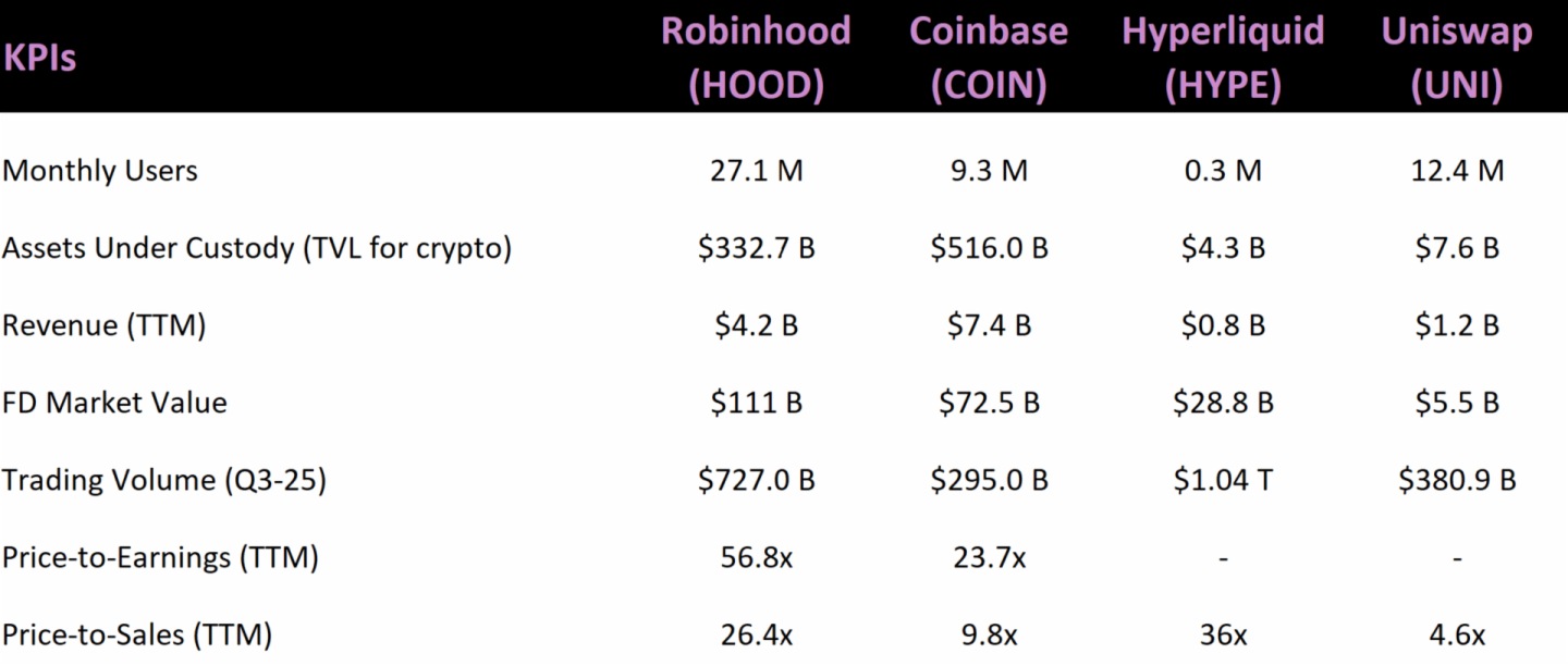 - 市場對 Robinhood 的定位是一家切入消費/零售金融賽道的「超級應用」;而 Coinbase 仍被視為一家「加密貨幣交易所」(盡管它的業務遠不止於此)。