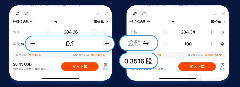 第二步,選數量:點擊【交易/買入】,在下單頁面,你可以選擇輸入「數量」(比如 0.5 股),也可以直接切換成輸入「金額」(比如 $50)。