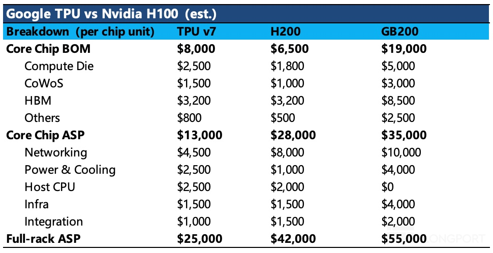 因此這種情況下,如果單顆係統級 TPU v7 價格再算上 Google 的溢價,那麼就相對 H200、B200 沒有明顯的性價比優勢了。