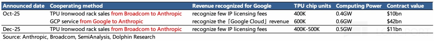 這裡面的特殊之處在於,在 Anthropic 預定的近 100 萬塊 TPU 上(第一筆 40 萬塊 + 第二筆 40-50 萬塊),Google 並未染指 TPU 硬件收入部分。海豚君認為,至少在與英偉達 idia 合作密切的頭部廠商上,Google 還是更傾向於不賺所謂的 「鏟子錢」。