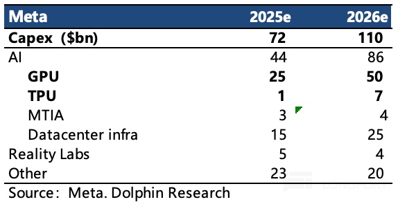 根據機構原來預期,Meta 2026 年 Capex 為 1000-1200 億,近期 Meta 有意收縮元宇宙投入(約減少 30%)。GPU 原計劃採購 100 萬顆,大頭為 GB200,另外為 V100。
