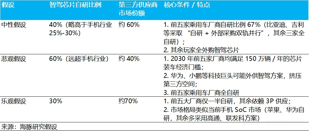 ② 悲观假设:车企自研意愿与能力极强,自研比例 60%(前五大乘用车厂商全自研),远超手机行业,主要由于:a. 2030 年前五家厂商均能满足 150 万辆/年的芯片装车经济门槛;b. 华为、小鹏等科技巨头可能外供智驾方案,进一步挤压第三方供应商空间。