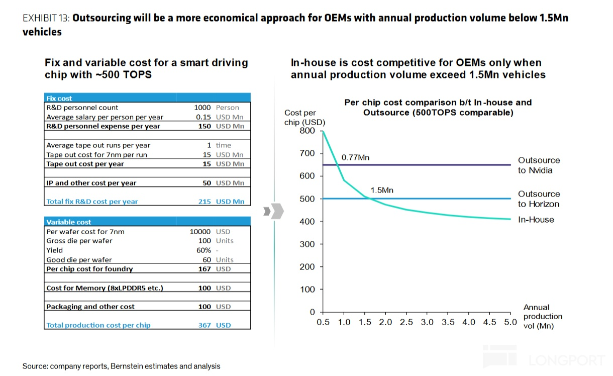 ① 对比英伟达:当外购英伟达芯片价格约为 650 美元/片时(约两颗 Orin-x 售价),车企需要实现每年约77 万辆的芯片装车量,自研芯片的 “固定成本 + 可变成本” 才会低于外购总成本。