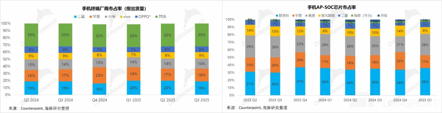 终端市场高度集中:全球前五大手机厂商合计占据了约 68% 的出货份额。
