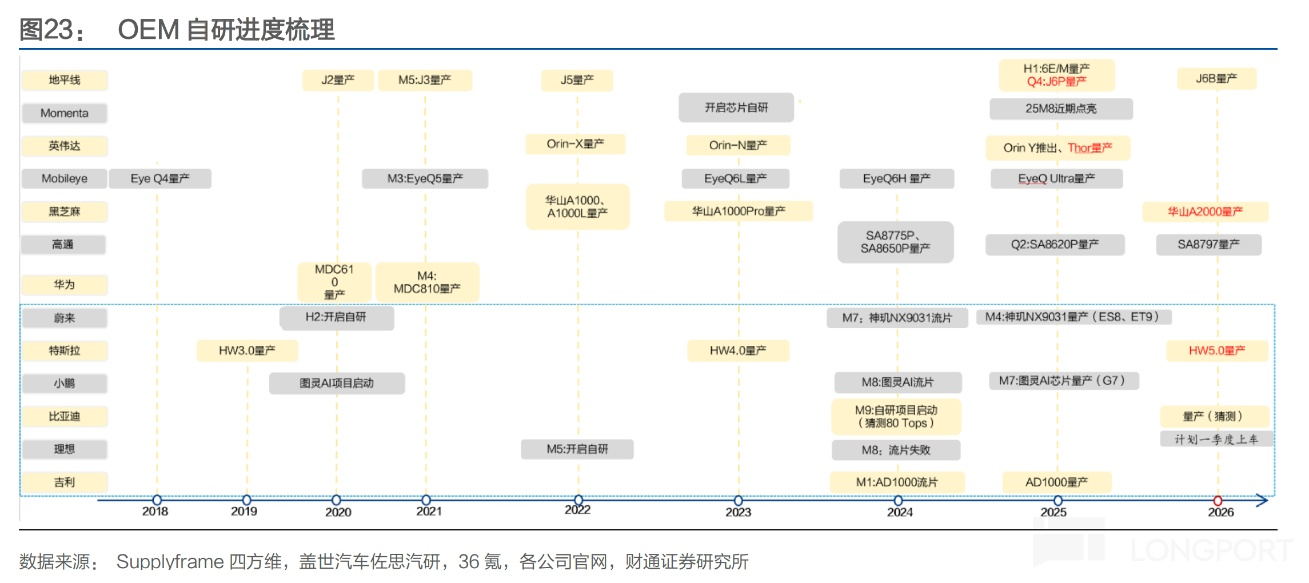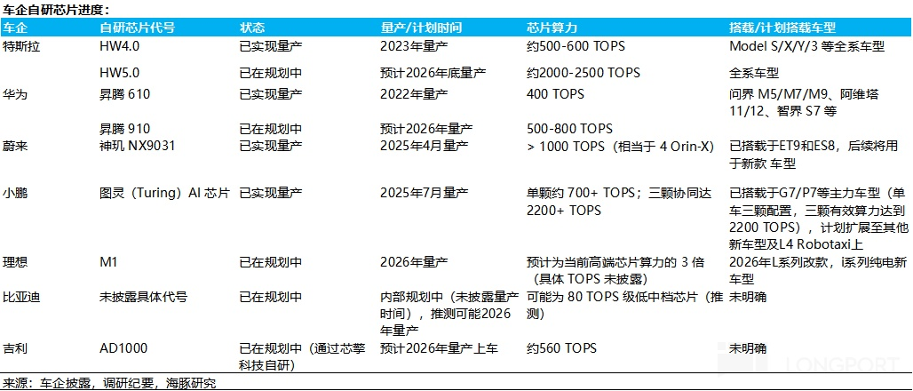 a. 目前已经实现智驾芯片的自研且已经量产上车的车企有: 特斯拉(HW4.0)、华为(升腾 610)、蔚来(神玑 NX9031)、小鹏(图灵 AI 芯片),均聚焦 500-1000 TOPS 大算力芯片。特斯拉下一代芯片算力峰值预计达 2000-2500 TOPS,直接对标英伟达 Thor-X-Super 芯片,将于 2026 年底量产。