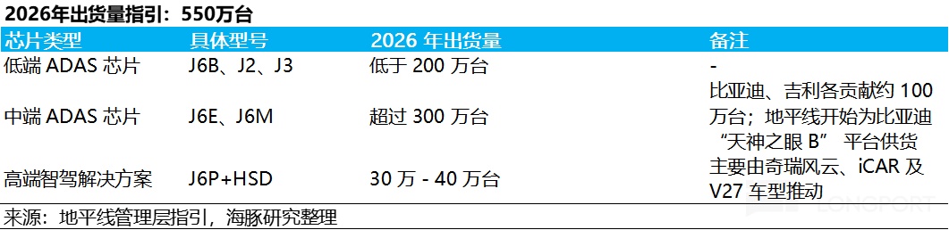 ① 2026 年搭载高阶芯片 J6P 的 HSD 方案出货量预计在 20 万套左右,仅占总出货量(指引约 550 万套)的 3.6%;也意味着 J6P 在 2026 年仍然没迎来大规模放量;
