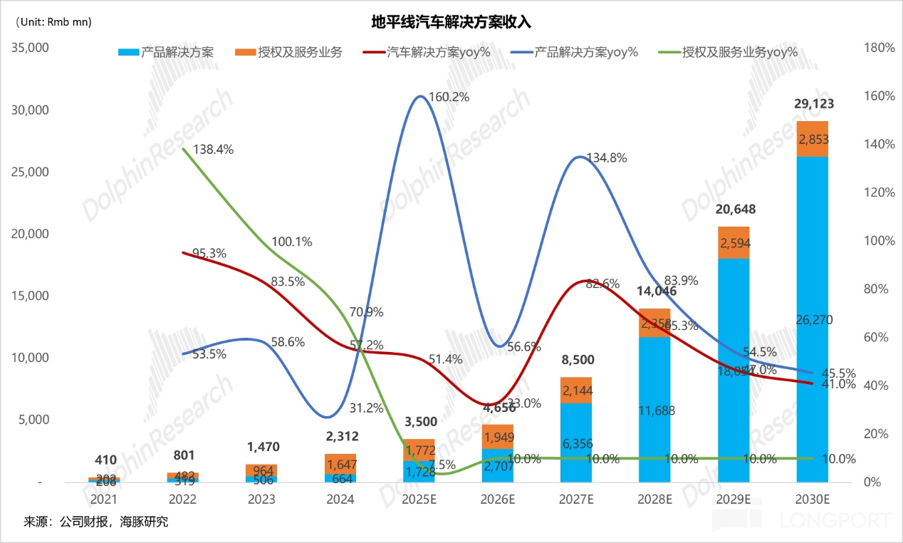 在此结构下,海豚君预计公司芯片平均售价(ASP)将同比提升 16.2% 至 492 美元。基于约 550 万套的出货量指引,预计地平线 2025 年产品解决方案业务收入为 27.1 亿元人民币,同比增长 57%。