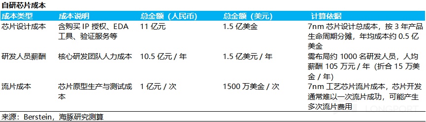 自研芯片并非一次性投资,而是一项需要持续 “输血” 的长期工程。根据 Berstein 估算,自研智驾芯片每年的固定成本投入就高达约 2.15 亿美元(15.3 亿元),主要包含芯片设计成本,研发人员薪酬,以及流片成本: