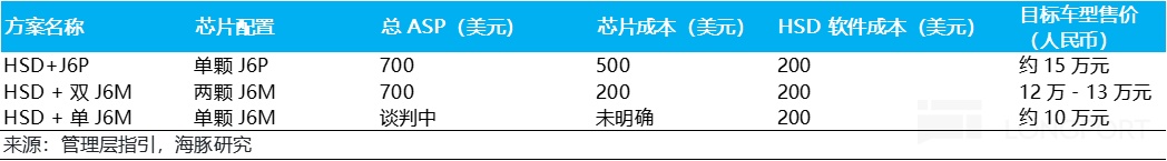 对于单价端(ASP):管理层将高阶 HSD(城市 NOA 算法) 匹配 3 种不同的出货模式,整体 HSD 出货为 40 万台,指引超过一半将由 HSD+J6P 贡献: