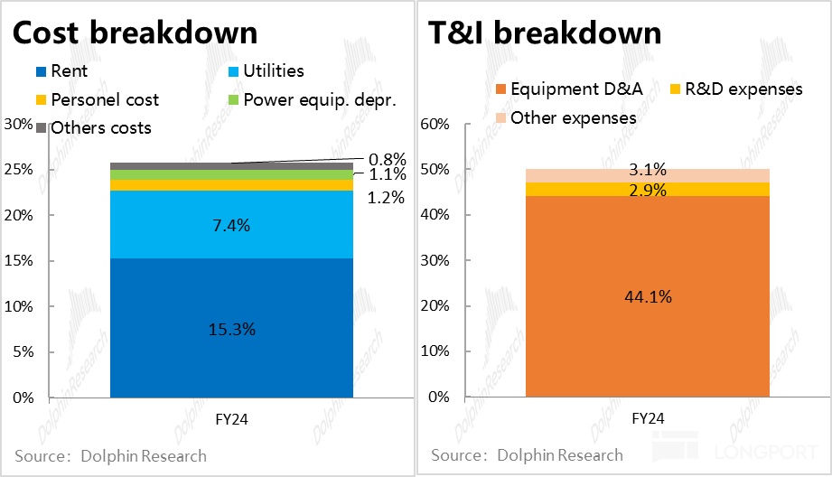 a. 軟硬件折舊(歸在 T&I 内)是最大單一項,此一項就佔 24 年總收入的約 44%。清晰體現出,重資産生意購置 IT 設備、IT 設備(主要是 GPU)採購價格高,對公司盈利能力的明顯壓制。