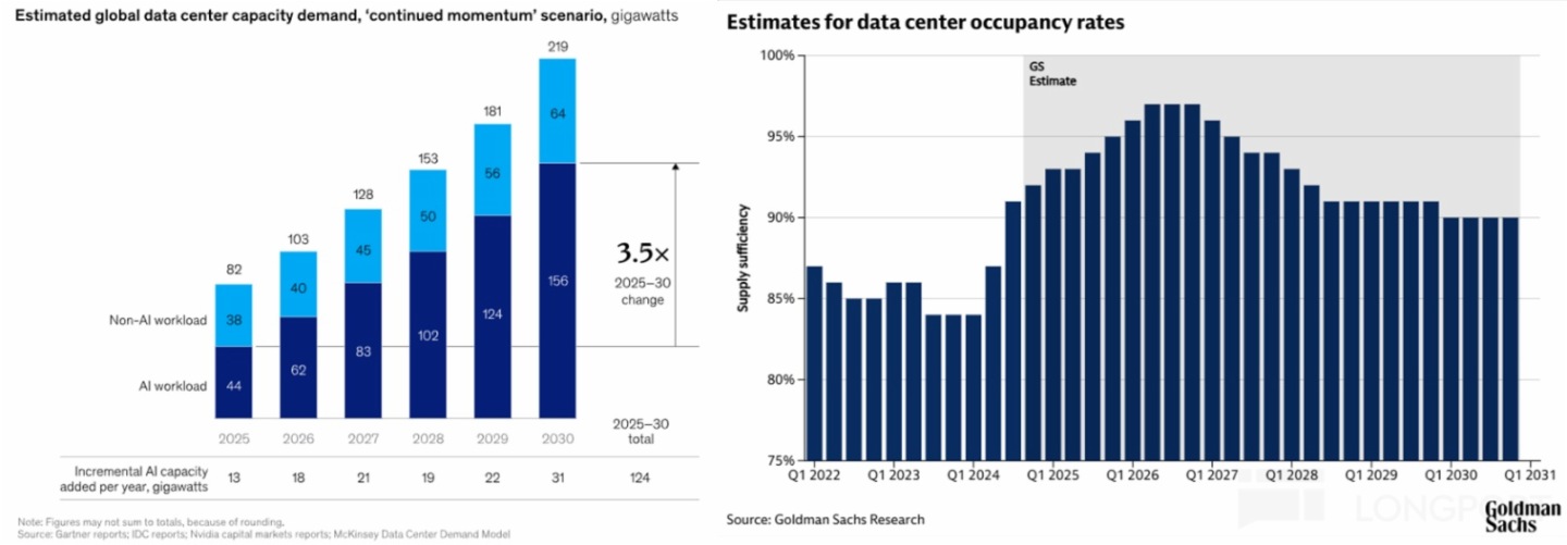Gartner、IDC 等預期2025~2030 年 5 年間全球對數據中心算力的總需求會增加約 1.7x,其中 AI 算力需求更是會增長 2.5x。而高盛的估算數據中心的平均利用率在 2022~24 年初約為 85%,但在 25~28 年間會有一個明顯的波峰、最高可超 95%。