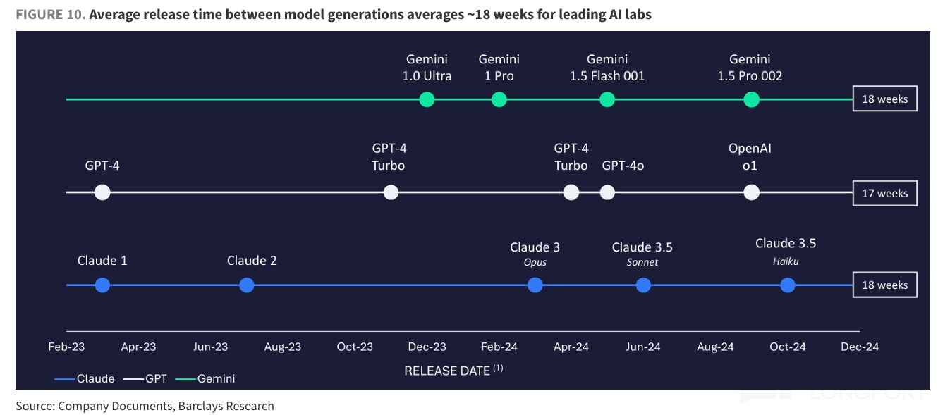 同時,從 2023 年初~2024 年底,ChatGPT、Gemini 和 Claude 這三個頭部模型平均每 18 周(即 4~5 個月)就會進行一次較大叠代。模型快速叠代,不僅是更高算力,也是對數據中心的硬件或軟件架構的要求更新。