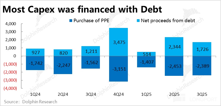 資産折舊攤折 6 年下,成本率還有 75%,可想而知公司的資本開支對收入的消耗有多大。這種情況下,公司的資本開支基本要靠舉債。當下,每個季度,公司基本都是把全收到的收入,再倒貼一倍的收入,投入到資本開支當中。
