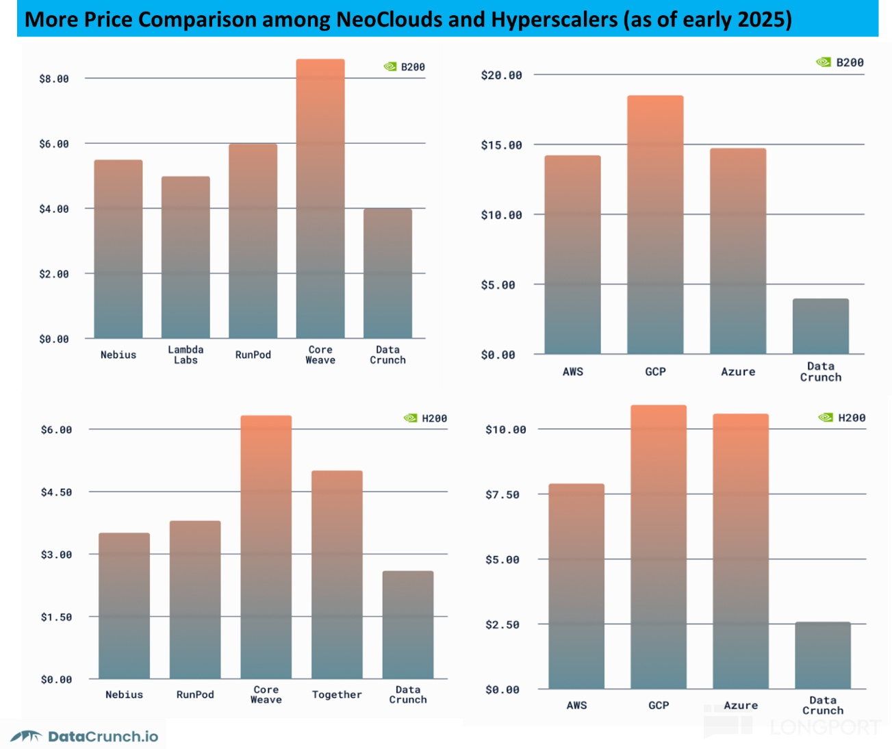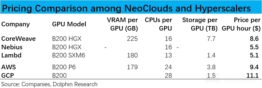 a. 定價:首先,影響盈利能力的第一要素就是對産品的不同定價能力。對類似的單個 B200 GPU 的定價,可以看到雲巨頭的定價($9 ~ $11/h)普遍高於新雲($5 ~ $8/h)。在運營成本類似的情況下,新雲的利潤率就是會低於巨頭們。