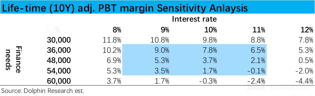 對應對 60,00Capex 下的 adj.EBIT 利潤率(約 20%),利息産生約的拖累在 11%~20%。