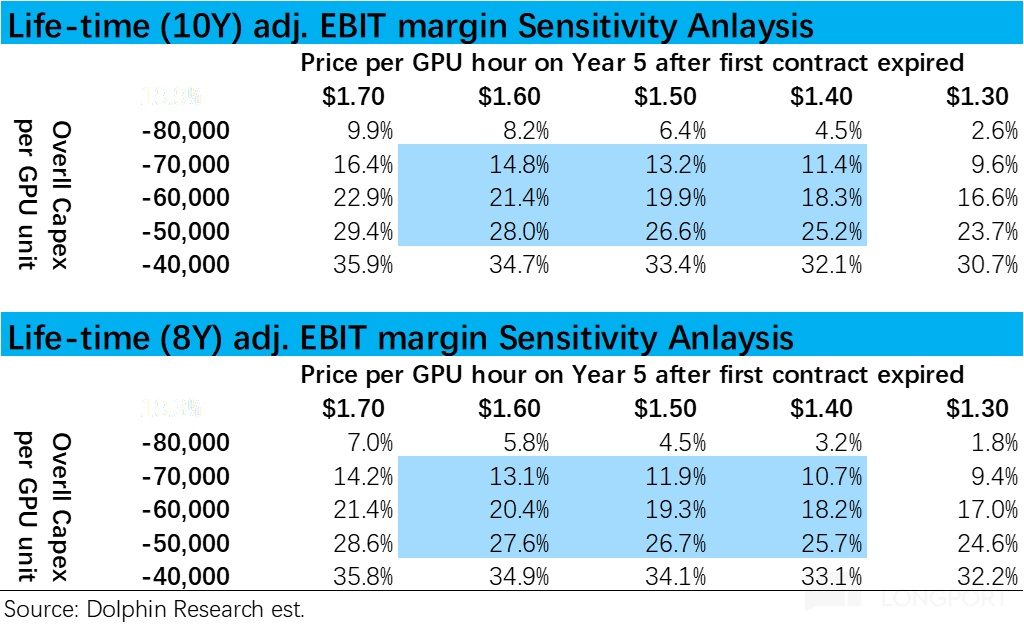 這作為後續估值時,判斷公司長期穩態利潤率的基準。根據不同的合同到期後算力定價,和前置 Capex 投入多少,公司 adj.EBIT 利潤率的敏感性區間在 10%~28% 左右。