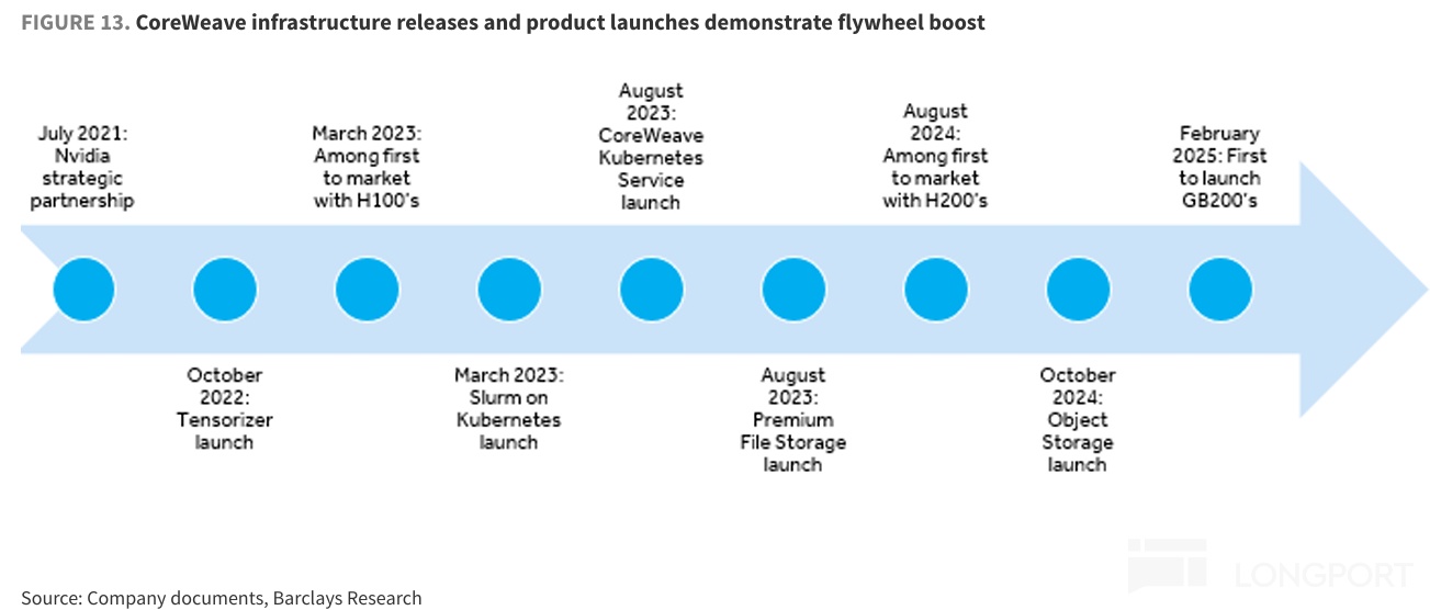 而 21 年英偉達和公司簽訂戰略合作協議後,後續H100,H200,GB200 等上綫時,CoreWeave 一直是首批能夠獲得當時最高端芯片的公司(之一)。