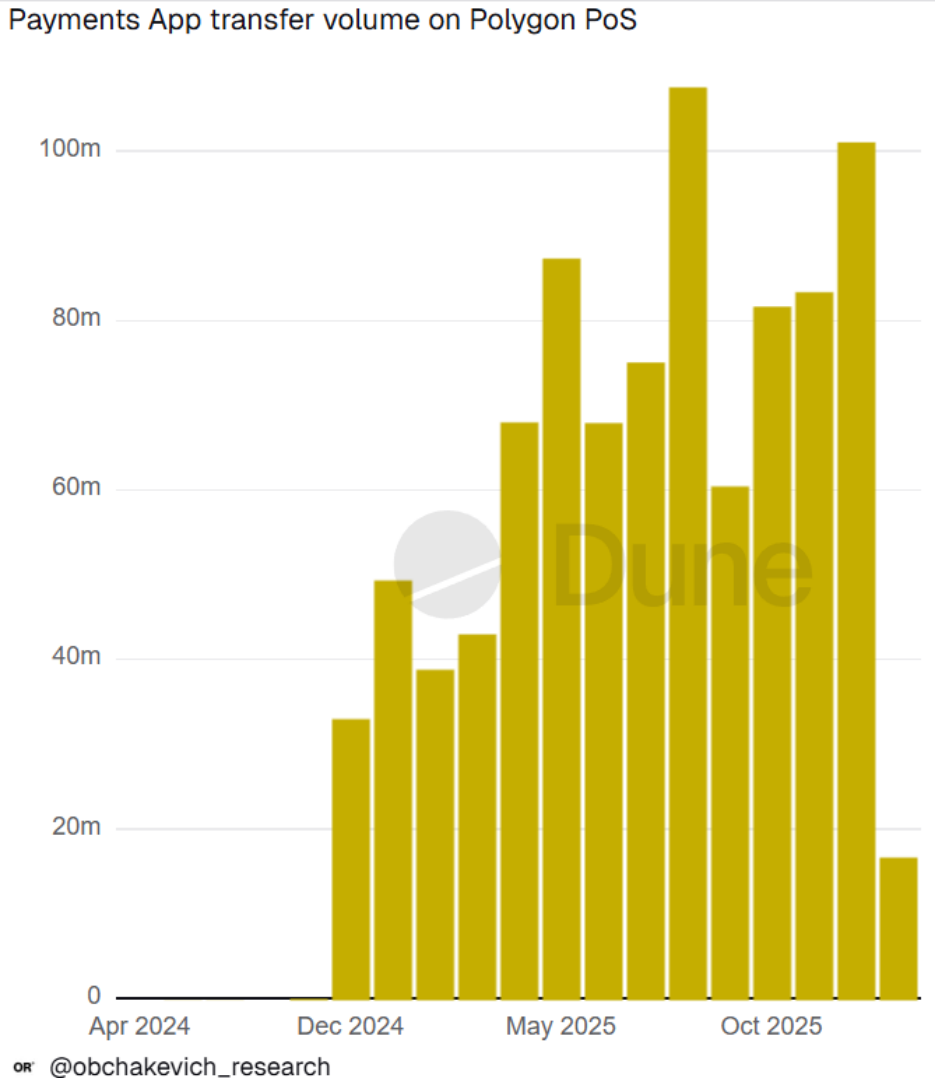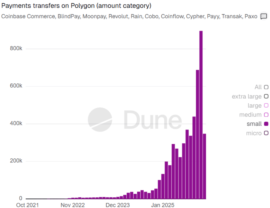 Polygon也在大幅滲透日常消費場景。Dune數據顯示,截至2025年底,Polygon上的小額支付(單筆金額在10至100美元之間)交易筆數接近90萬筆,創下歷史新高,較11月增長了超30%。