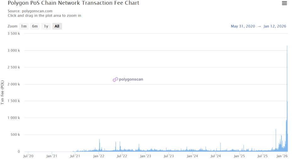 自2026年初以來,Polygon已累計産生高於170萬美元的手續費,並銷毀超過1,250萬枚POL代幣(約150萬美元)。