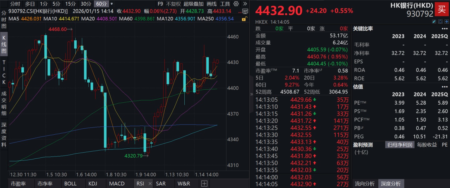 截至2026年1月15日 14:14,HK銀行指數(930792)上漲0.55%,成分股工商銀行(01398)上漲1.60%,農業銀行(01288)上漲1.08%,交通銀行(03328)上漲1.06%,中信銀行(00998)上漲0.85%,重慶銀行(01963)上漲0.39%。