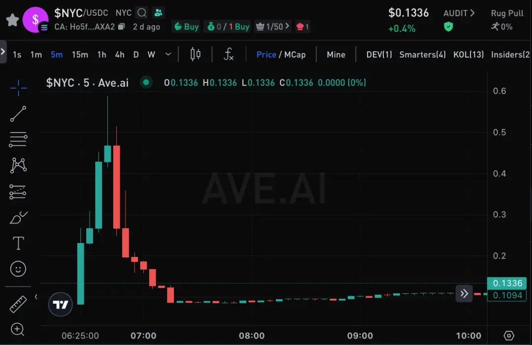 該地址共移除了約2,377,376USDC,導致NYC代幣價格下跌超過80%,市值從最高的6億美元縮水至不足1億美元。