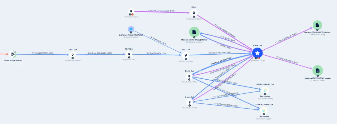 地址9Ty4M從Mayan跨鏈橋和Kraken用戶地址獲取了1,000,001 USDC,隨後創建了NYC-USDC的流動性池。在北京時間1月13日6:43移除流動性導致價格暴跌後,地址9Ty4M從當天16:15開始持續小額買入NYC代幣,持續到現在。