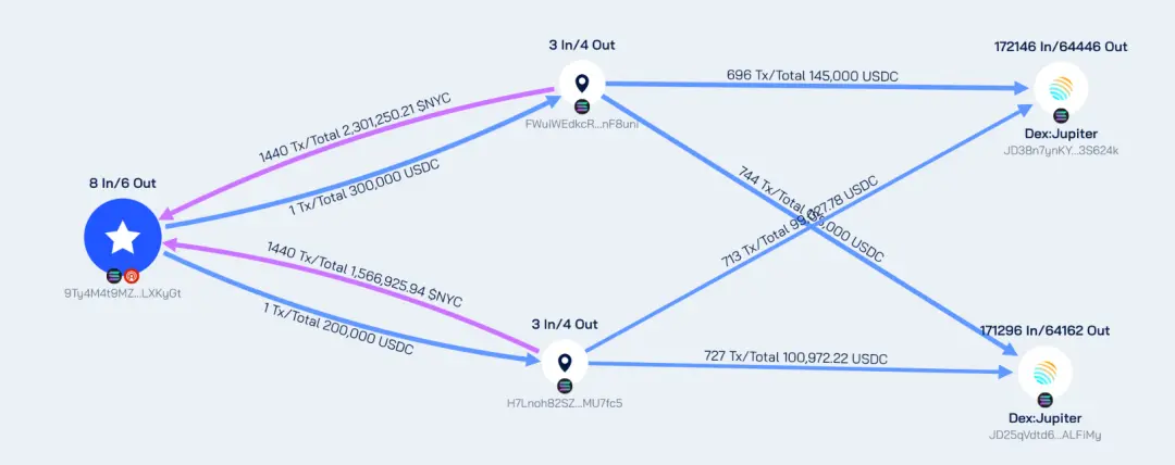 通過BeosinTrace的數據統計,目前地址9Ty4M已通過地址FWuiWEdkcR1NLPjozcEuErtGGDZG5kyPu3oszmnF8uni和地址H7Lnoh82SZghsXmoqffoCiFz7U3D1cwZ8ZPjRUMU7fc5分別在Jupiter買入2,301,250和1,566,926枚NYC代幣,但NYC價格僅回到0.133-0.134,總市值約為1.3億美元。