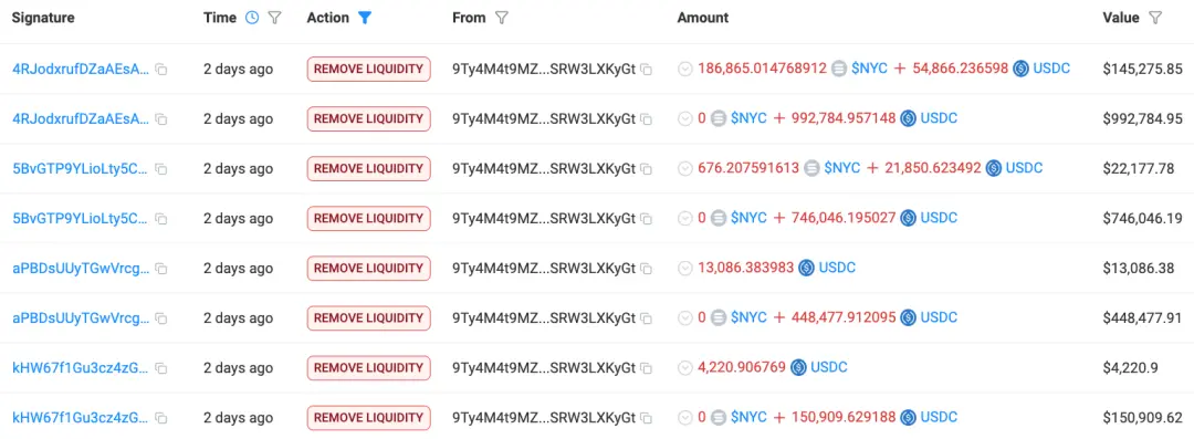 北京時間1月13日,紐約前市長 EricAdams在社交媒體上宣佈推出NYC代幣(代幣合約地址為Ho5fkxk9uqUuVN5kt7TUFacduWCpKPAuYkM9HD3KAXA2)。但代幣上綫30分鐘後,流動性池的創建地址9Ty4M4t9MZArhJBKFWbYrzeqdMf2Ua5eHWSRW3LXKyGt陸續移除流動性: