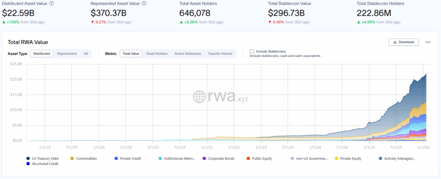 RWA.xyz 最新數據披露,截至2026年1月23日,RWA 鏈上總市值達225.9億美元,環比上月同期增加7.58%,增長穩健;資産持有者總數增至約64.61萬,環比上月同期上漲8.36%。