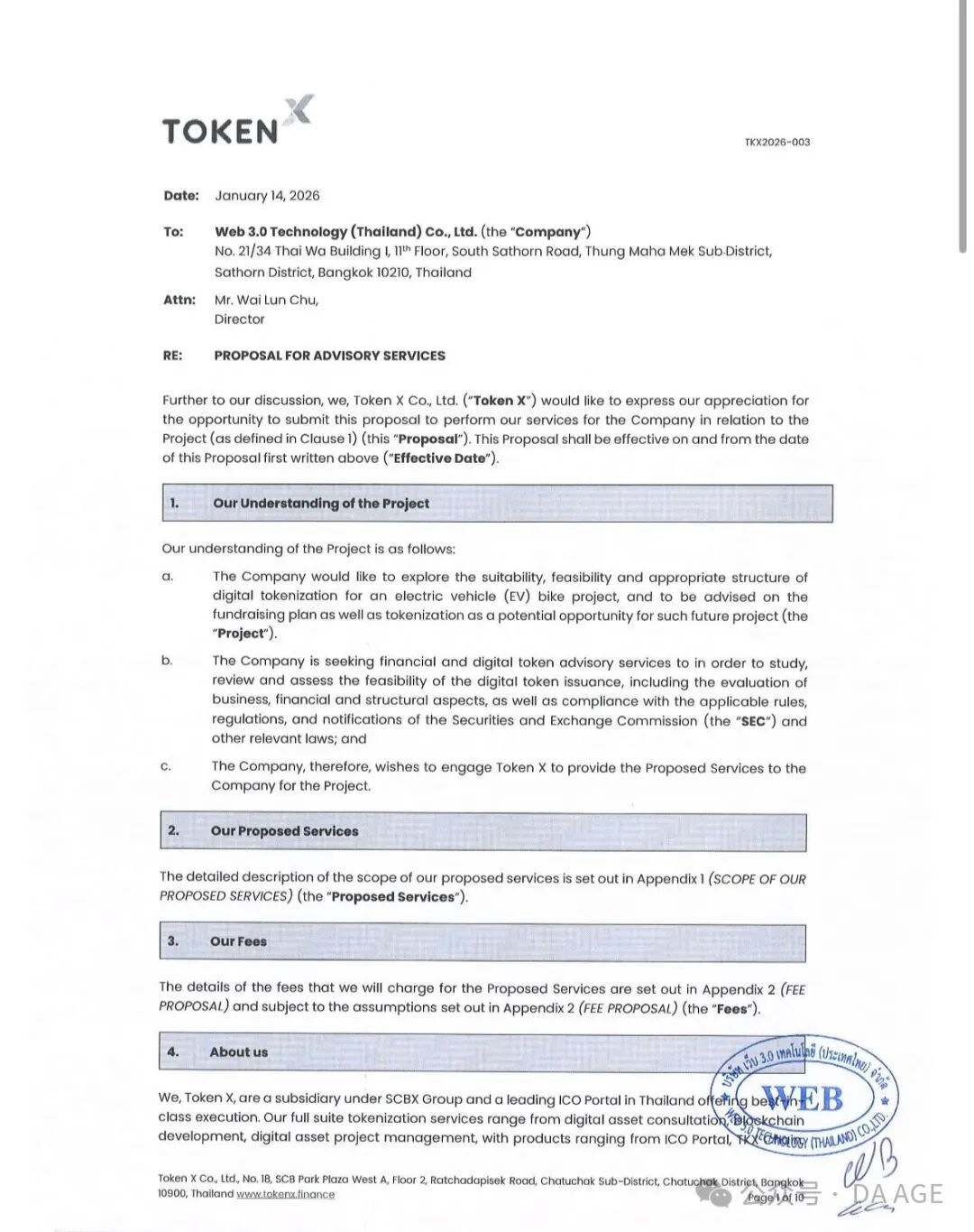 Web3.0 Technology (Thailand) Co., Ltd.與泰國領先的數字資產代幣化企業Token X達成合作。EV Bike項目旨在推廣可持續城市出行,並踐行對綠色社會可持續發展通證 (GSST) 的落實。合作旨在探討將數位化技術應用於電動車 (EV) 自行車專案的適用性、可行性和恰當架構,並就此類未來專案潛在機遇的相關事宜尋求專業建議,並尋求金融及數位資產諮詢服務,以研究、審查和評估發行數位資產的可行性,包括評估商業、財務和結構層面的因素,以及是否符合證券交易委員會(SEC)及其他相關法律的適用規則、法規及通知要求。因此Token X將為EV Bike專案公司提供相關服務。