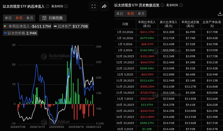 PANews 1月25日消息,根據 SoSoValue 數據,本周交易日(美東時間 1 月 19 日至 1 月 23 日)以太坊現貨 ETF 淨流出 6.11 億美元。