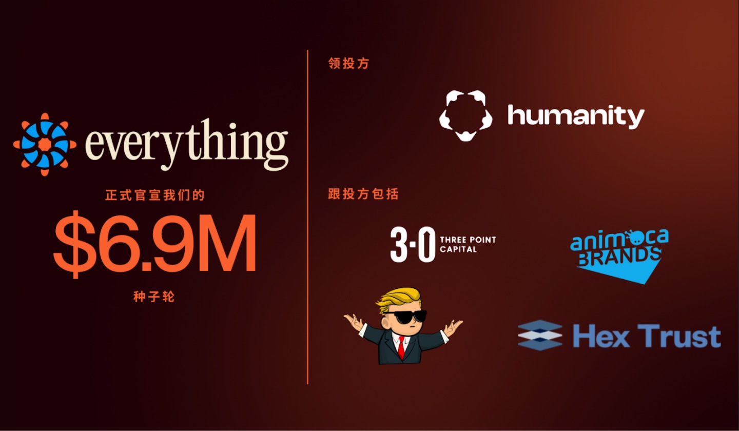 2026 年 1 月 26 日,Everything 宣佈完成 690 萬美元種子輪融資。本輪融資由 Humanity 旗下風投部門 Humanity Investments 領投,Animoca Brands、Hex Trust、WallStreetBets 創始人 Jamie Rogozinski,以及 Three Point Capital 聯合參投。