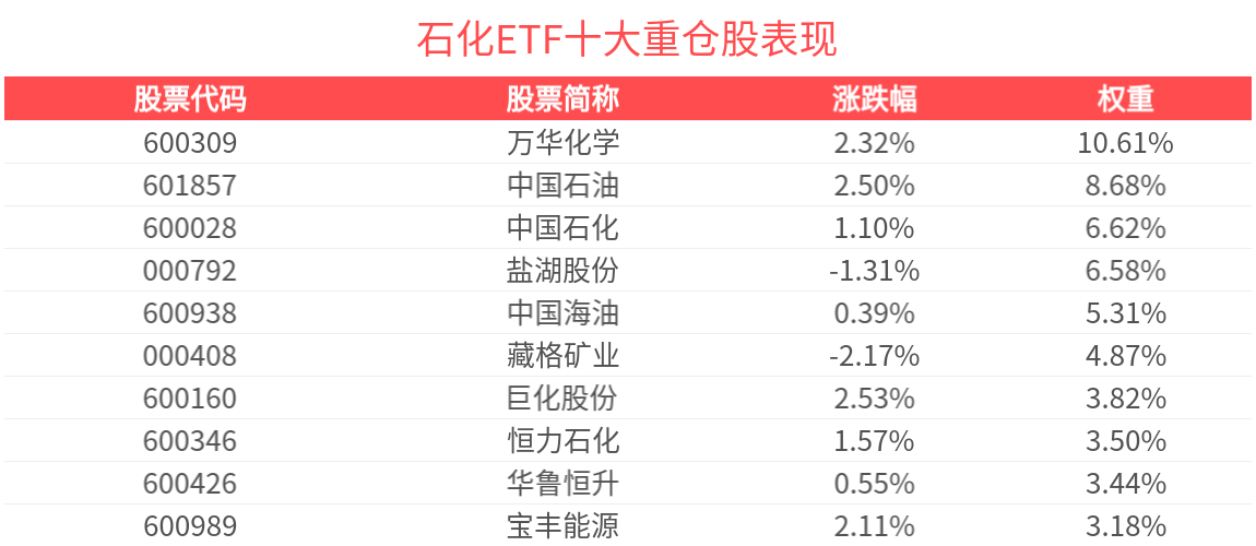 石化ETF緊密跟蹤中證石化産業指數,數據顯示,截至2025年12月31日,中證石化産業指數前十大權重股分別為萬華化學、中國石油、中國石化、鹽湖股份、中國海油、藏格礦業、巨化股份、恒力石化、華魯恒升、寶豐能源,前十大權重股合計佔比56.73%。