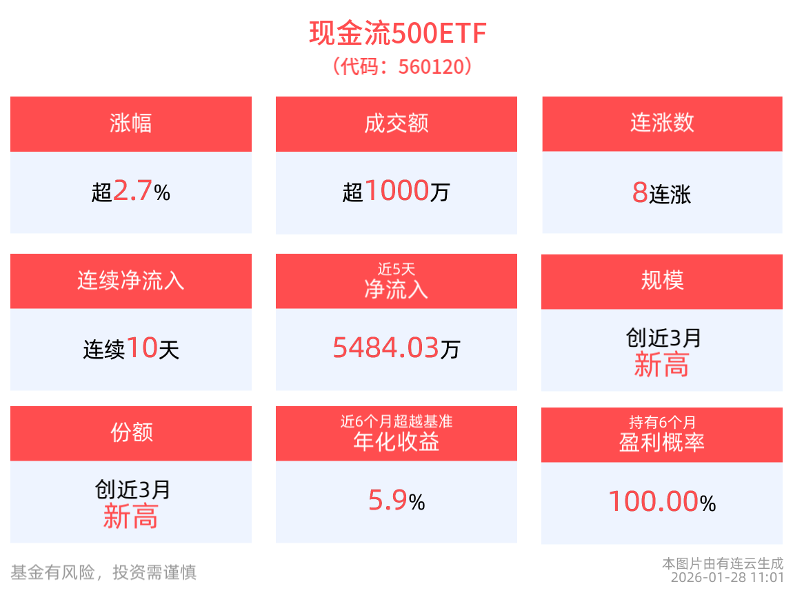 截至1月27日,现金流500ETF近6月净值上涨43.03%。从收益能力看,截至2026年1月27日,现金流500ETF自成立以来,最高单月回报为7.97%,最长连涨月数为3个月,最长连涨涨幅为15.21%,涨跌月数比为4/1,上涨月份平均收益率为5.34%,月盈利百分比为80%,月盈利概率为88.46%,历史持有6个月盈利概率为100%。截至2026年1月27日,现金流500ETF近6个月超越基准年化收益为5.9%。