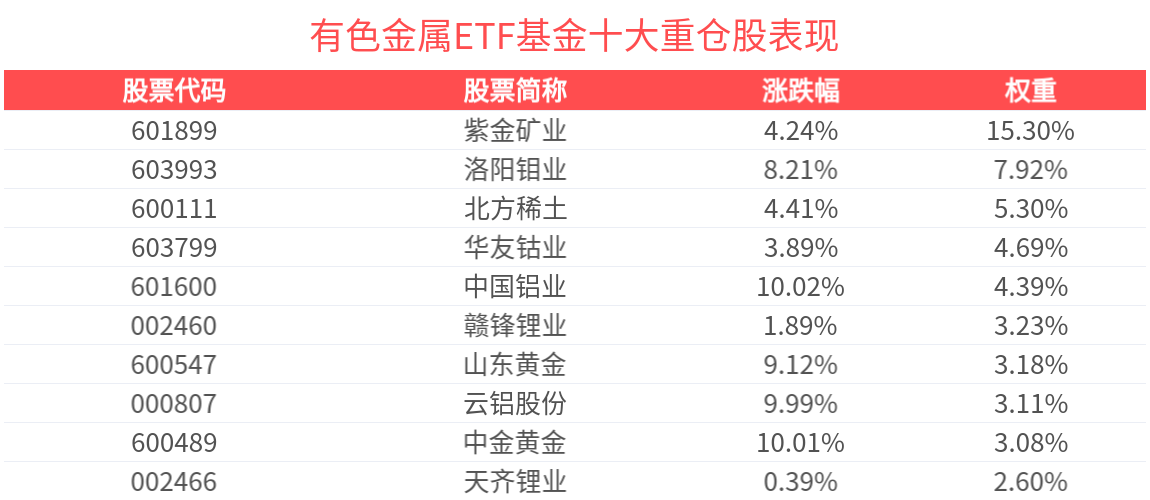有色金屬ETF基金緊密跟蹤中證細分有色金屬産業主題指數,截至2025年12月31日,中證細分有色金屬産業主題指數(000811)前十大權重股分別為紫金礦業、洛陽鉬業、北方稀土、華友钴業、中國鋁業、贛鋒鋰業、山東黃金、雲鋁股份、中金黃金、天齊鋰業,前十大權重股合計佔比52.98%。(以上所列股票僅為指數成份股,無特定推薦之意)