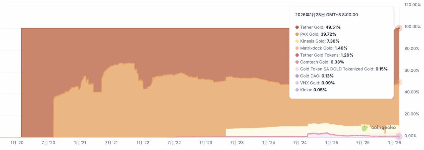 CoinGecko數據顯示,截至1月28日,XAU₮的流通市值已達27億美元,過去一年增長了約91.3%,在代幣化黃金賽道中佔據49.5%的市場份額,穩居第一。