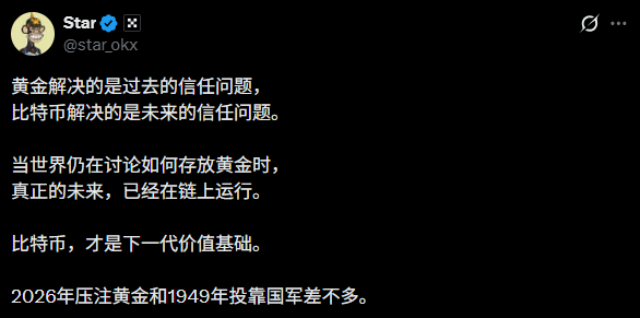 然而,在這種表面的繁榮之下,一種更為深刻、殘酷的代際資産轉移正在發生。正如OKX Star所言:“黃金解決的是過去的信任問題,而比特幣解決的是未來的信任問題。2026年壓注黃金,和1949年投靠國軍差不多。”