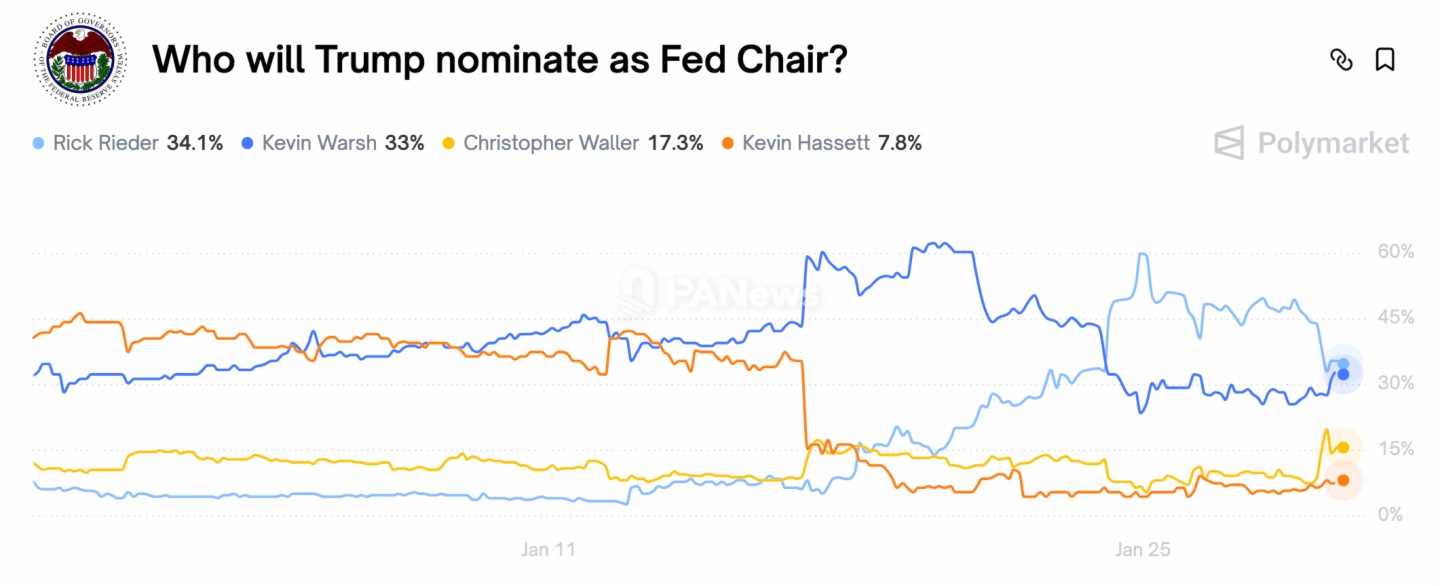 他當天在Polymarket等預測市場上勝選的概率從3%翻倍至6%;而在達沃斯論壇上特朗普對其大加贊賞之後,Rieder的勝率更是一度飙升至60%。截至1月29日,Rieder與前美聯儲理事凱文·沃什並駕齊驅,概率均在33%左右: