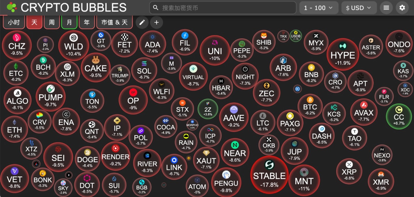 今日市值前100幣種最大跌幅:Stable 跌 17.8%、Hyperliquid 跌 11.8%、Mantle 跌 11%、Worldcoin 跌 10.3%、Uniswap 跌 10%。