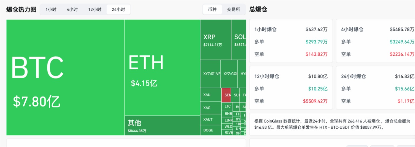24小時爆倉數據:全球共266416人被爆倉 ,爆倉總金額為16.83億美元,其BTC爆倉7.8億美元、ETH爆倉4.15億美元、XRP爆倉7114萬美元