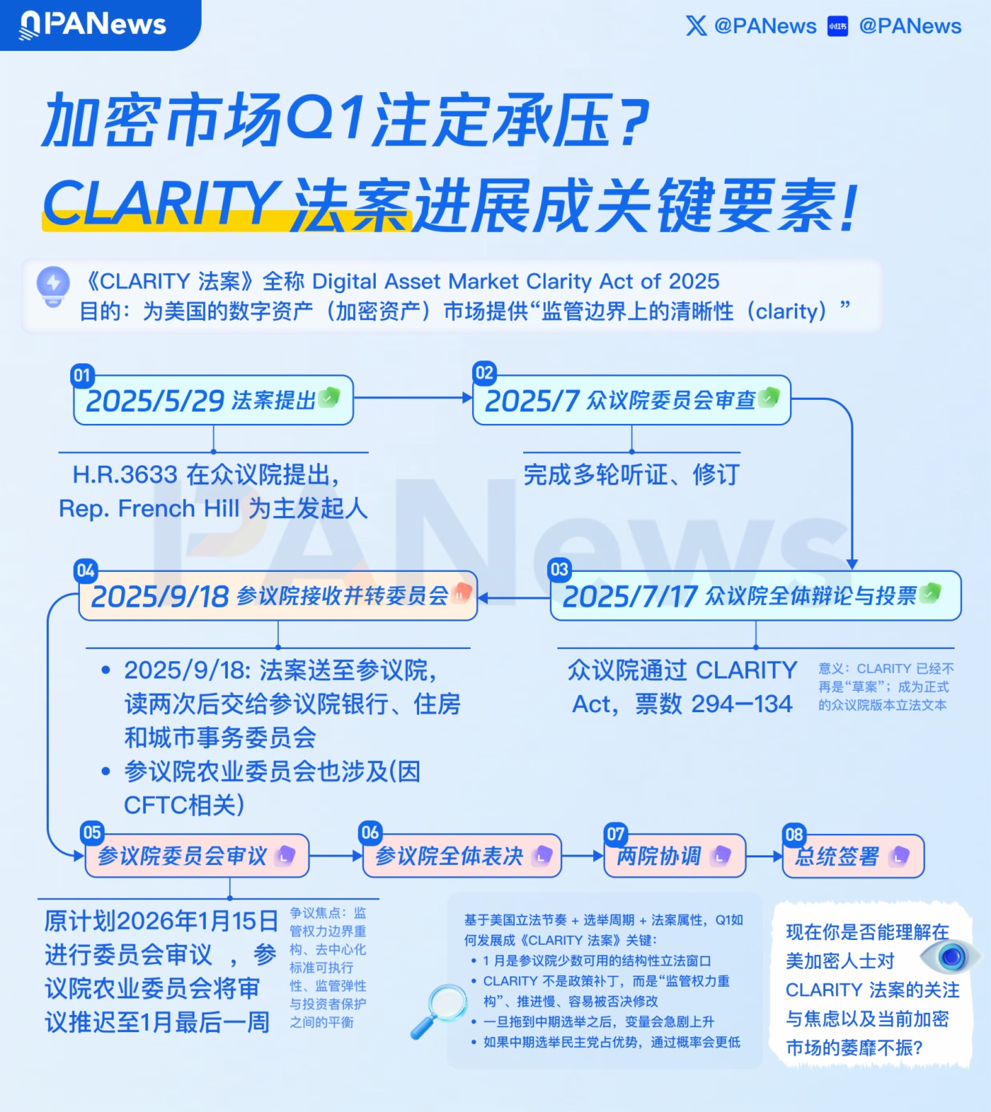 2026年1月末,美國參議院農業委員會以12票對11票的微弱黨派多數通過了旨在規範加密貨幣市場結構的《CLARITY法案》。