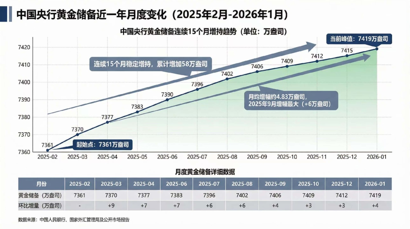 2026年2月9日早盤,現貨黃金盤中重返5000美元關口上方,並在此後快速走高,一度站上5040美元/盎司關口。消息面方面,2月7日,國家外匯管理局公佈的數據顯示,截至2026年1月末黃金儲備報7419萬盎司,較2025年12月末的7415萬盎司環比增加4萬盎司。回顧人民銀行本輪增持黃金,始於2024年11月,截至2026年1月末,已經持續15個月。