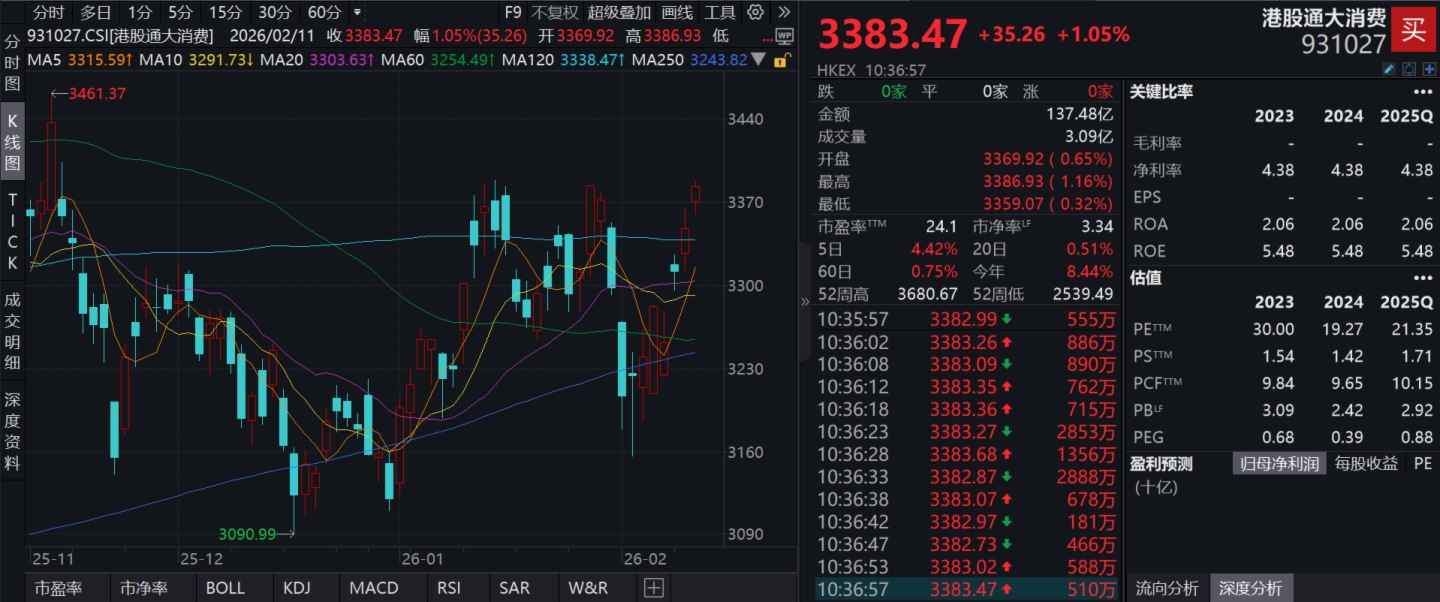 截至2026年2月11日 10:36,港股通大消費指數(931027)強勢上漲1.05%,成分股創科實業(00669)上漲6.91%,思摩爾國際(06969)上漲5.63%,比亞迪股份(01211)上漲3.97%,小鵬汽車-W(09868),藥明合聯(02268)等個股跟漲。