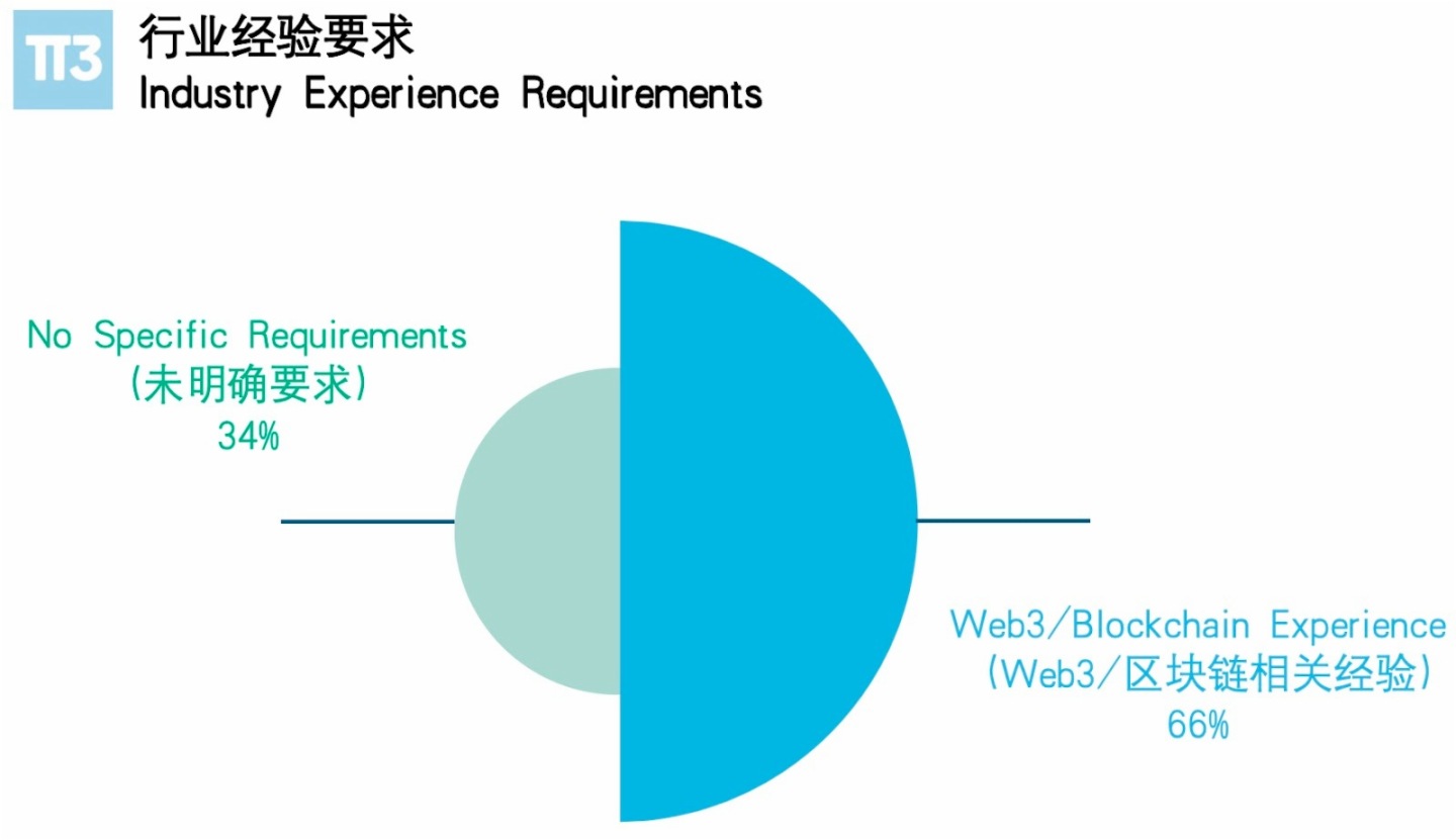 對於 CEX 而言,一個有交易經驗,認可區塊鏈邏輯以及了解“永續合約”、“鏈上交易”等名詞的人能夠極大地降低溝通成本。因此,行業認知(Know-how)的權重,在現階段遠高於通用技能。而接近七成的崗位對於0經驗的候選人來說並不友好,大量的潛在入行者只能爭搶剩下的三分之一機會。
