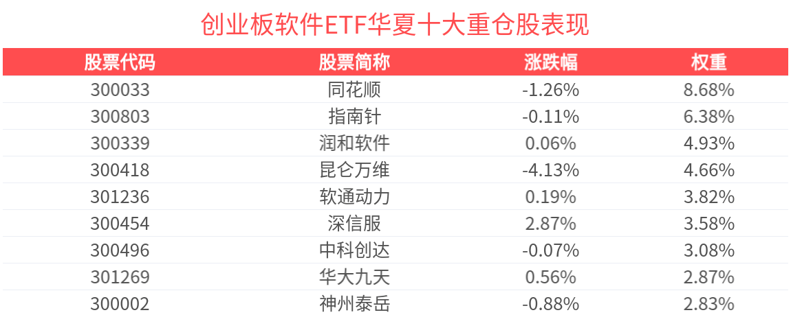 創業板軟件ETF華夏緊密跟蹤創業板軟件指數,截至2026年1月30日,指數前十大權重股分別為同花順、潤澤科技、昆侖萬維、指南針、深信服、潤和軟件、網宿科技、軟通動力、中科創達、漢得信息,前十大權重股合計佔比48.61%。(以上所列股票僅為指數成份股,無特定推薦之意)
