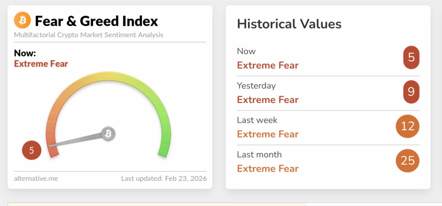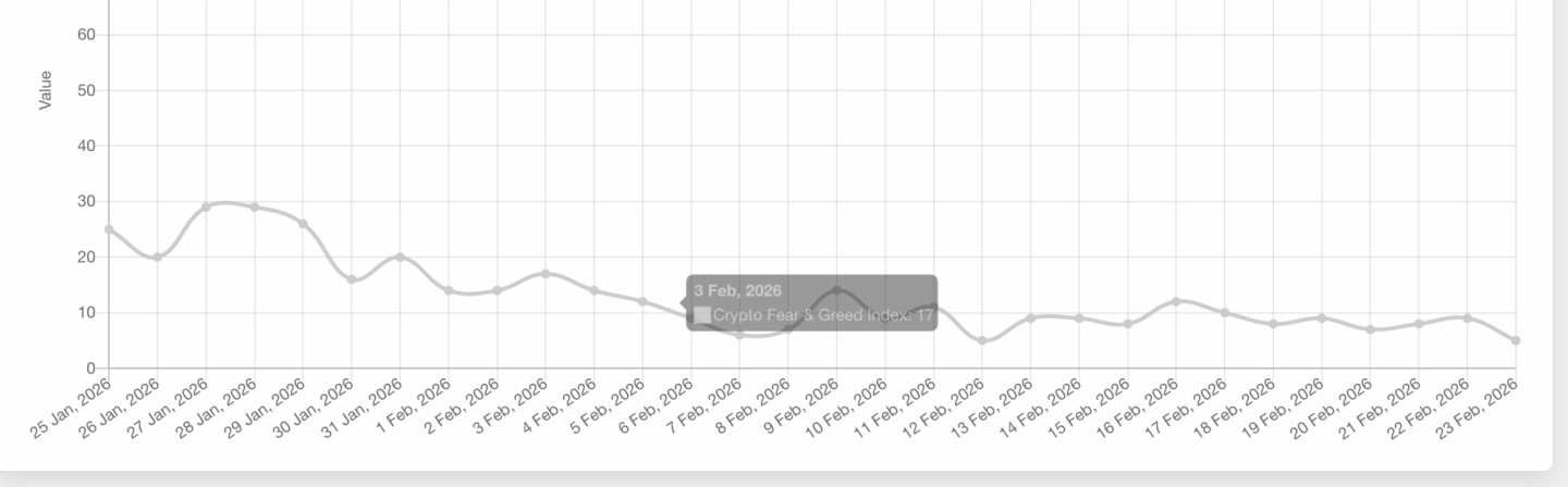 PANews 2月23日消息,據Alternative.me數據顯示,今日加密貨幣恐慌與貪婪指數繼2月12日後再次降至5,相較昨日的9進一步下滑,市場情緒持續處於「極度恐慌狀態」。目前,整個2月該指數均處於極度恐慌區間。