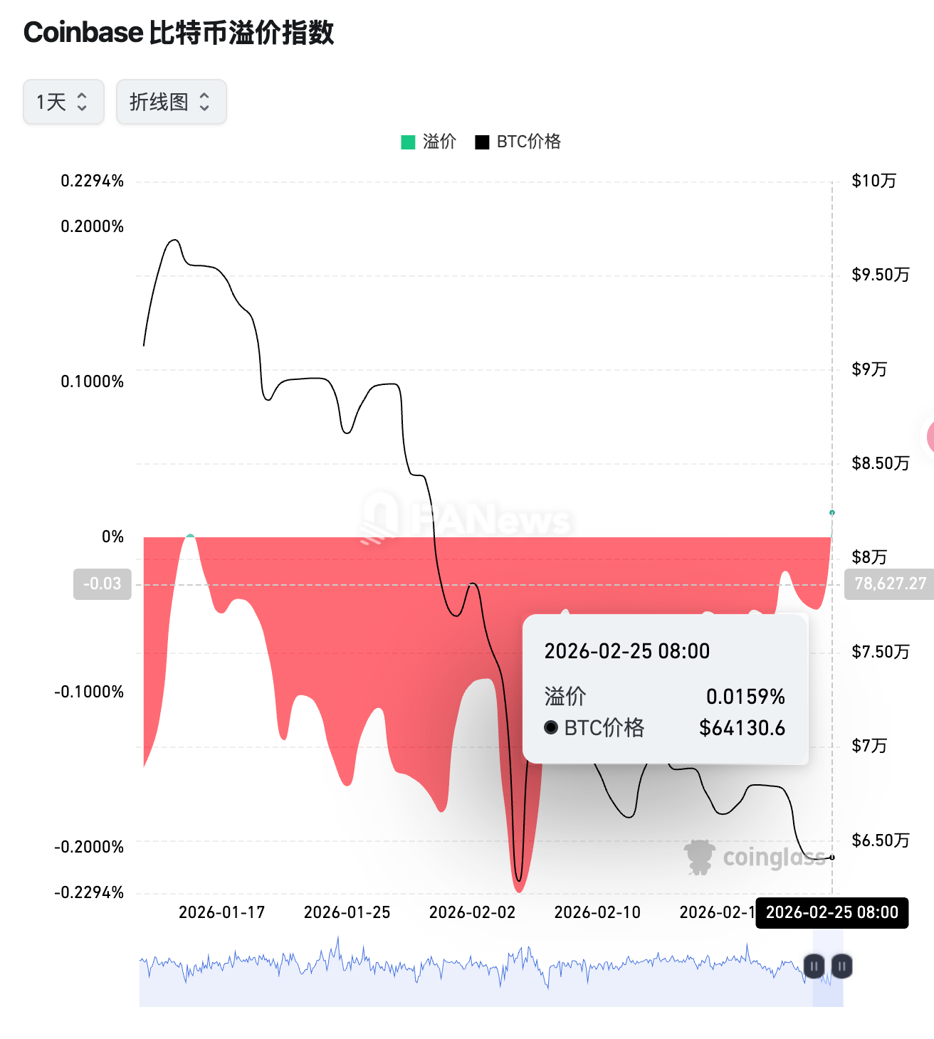 PANews 2月25日消息,據CoinGlass數據顯示,截至2026年2月25日08:00(UTC+8),Coinbase比特幣溢價指數報0.0159%,結束此前連續約40日負值區間,同期BTC價格報64130.6美元。該指標轉正通常反映美國市場買盤回暖,或預示資金情緒邊際改善。